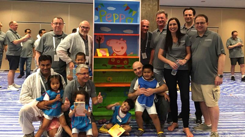 Leader Ecolab Company build and decorate bookshelves for children in need.
