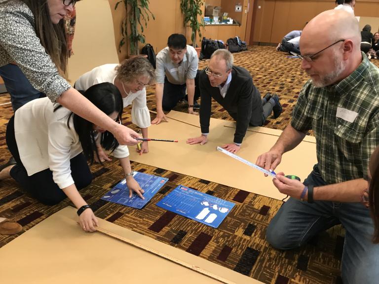 In Puppet Masters teams collect kits and props and then examine and discuss construction instructions. They divide into sub-teams to complete the various parts of the puppet. The puppet is assembled, controls affixed and the puppet decorated. Then the team stand the puppet up with the 9 controllers and work to perform simple human actions.